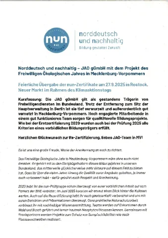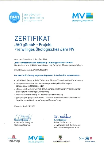 Das FÖJ MV der JAO gGmbH hat bereits vor fünf Jahren dieses Zertifikat erworben und sich nun rezertifizieren lassen. Ansporn ist die kontinuierliche Selbstevalution und Weiterentwicklung. So heißt es auf der NUN-Webseite: "nun = norddeutsch & nachhaltig – das Qualitätssiegel hält, was es verspricht! Wer damit geehrt wird, setzt sich konsequent und langfristig für Zukunftsbildung und für Zukunftschancen ein."