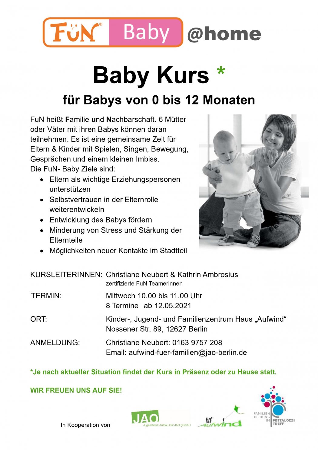 Am 12. Mai startet ein neuer FuN Baby-Kurs: gemeinsame Zeit für Eltern & Kinder mit Spielen, Singen, Bewegung, Gesprächen und einem kleinen Imbiss.