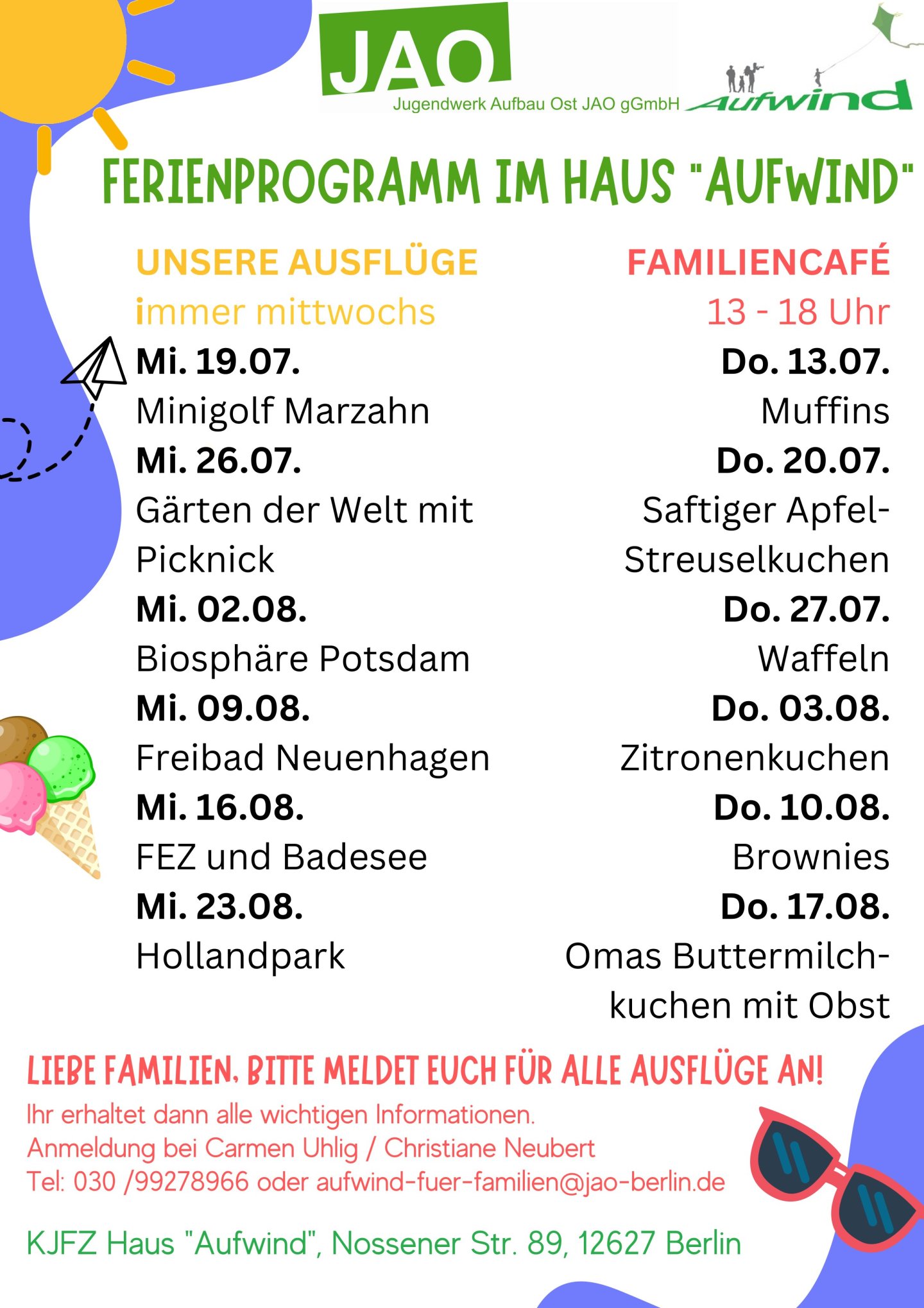 Wir haben für Euch ein buntes Programm mit Ausflügen und Back-Events im Familiencafé vorbereitet. Bitte meldet Euch für die Ausflüge bei Carmen Uhlig oder Christiane Neubert an.