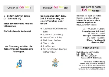 Am 29.04.2026 startet ein neuer FuN-Baby-Kurs für Eltern mit Babies im Alter von zwei bis zwölf Monaten. Über acht Wochen lang treffen Sie sich regelmäßig zur Kurszeit und können extra Eltern-Baby-Zeit genießen. Darüber hinaus treffen Sie andere Eltern und finden Gelegenheit zu lockerem Austausch. Alle Infos zu unserem Kurs - hier.