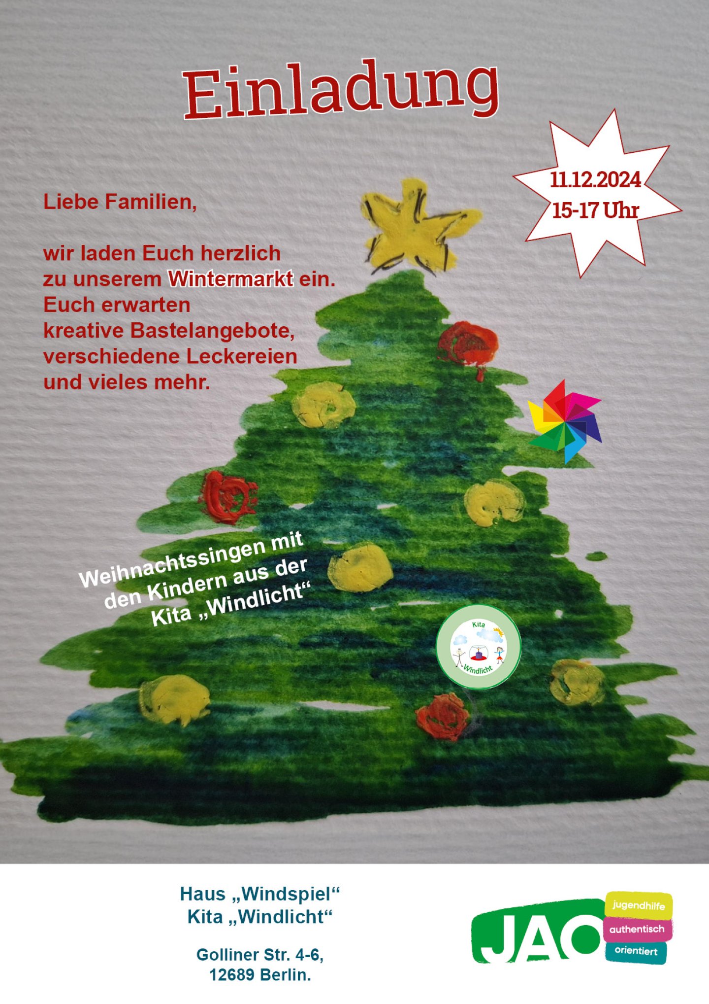 Wir laden Kinder und ihre Familien zum Wintermarkt in den Garten des Haus "Windspiel" und der Kita "Windlicht" ein, am 11.12.2025 von 15 bis 17 Uhr.