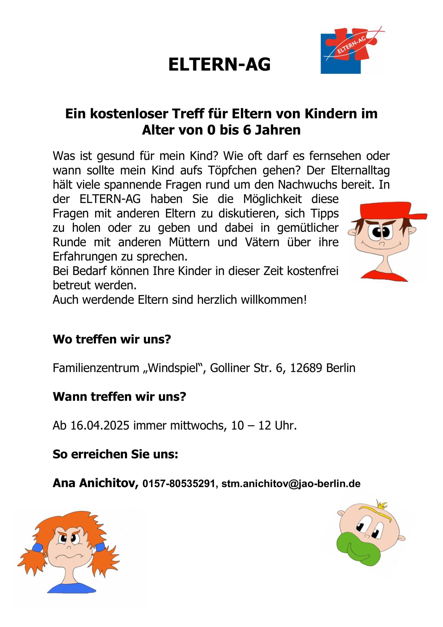 Der Eltern-Alltag hält viele spannende Fragen rund um den Nachwuchs bereit. In der ELTERN-AG haben Sie die Möglichkeit diese Fragen mit anderen Eltern zu diskutieren und in gemütlicher Runde Ihre Erfahrungen zu teilen. Bei Bedarf können Ihre Kinder in dieser Zeit kostenfrei betreut werden. Auch werdende Eltern sind willkommen.