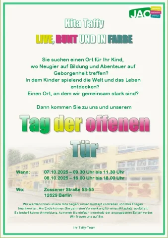 Wir werden Ihnen unsere Kita zeigen, unser Konzept vorstellen und Ihre Fragen beantworten. Am Ende können Sie gern eine Vormerkung für einen Kitaplatz ausfüllen.