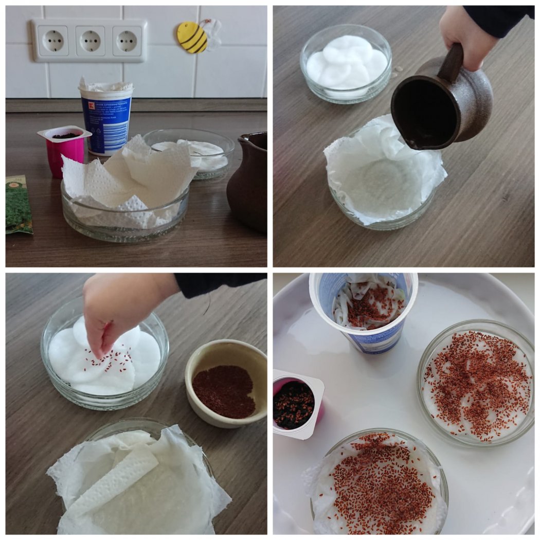 In zwei Gefäßen ist Küchenpapier (vorn in der Mitte + blauer Joghurtbecher). In der rechten Schale liegen Wattepads und im pinkfarbenen Becher sind Erde und Wattepad.