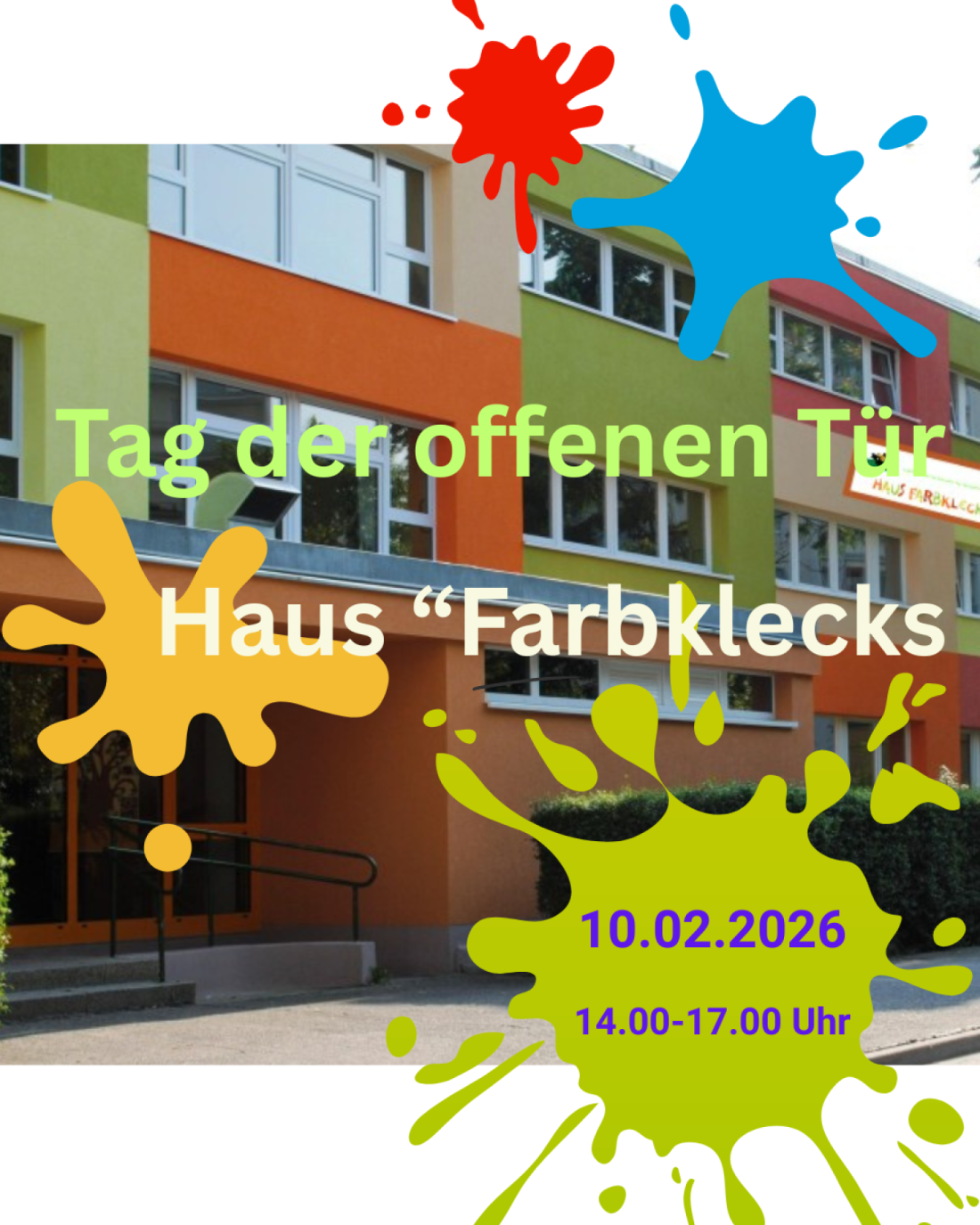 Am 24.8.2023, 14.30 Uhr bis 17 Uhr laden wir alle interessierten Eltern, die für das Kitajahr 2024/25 einen Kitaplatz suchen, in unser Haus "Farbklecks" ein. Wir führen Sie durch die Kita, stellen Ihnen unser Konzept vor und beantworten gern Ihre Fragen.