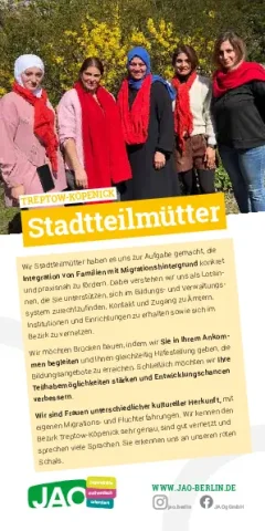Die JAO-Stadtteilmütter sind entweder in ein Familienzentrum integriert und arbeiten regional im jeweiligen Stadtteil (KJFZ Aufwind und KJFZ Im Kosmosviertel) oder sie sind im gesamten Bezirk aktiv (Marzahn-Hellersdorf oder Treptow-Köpenick).