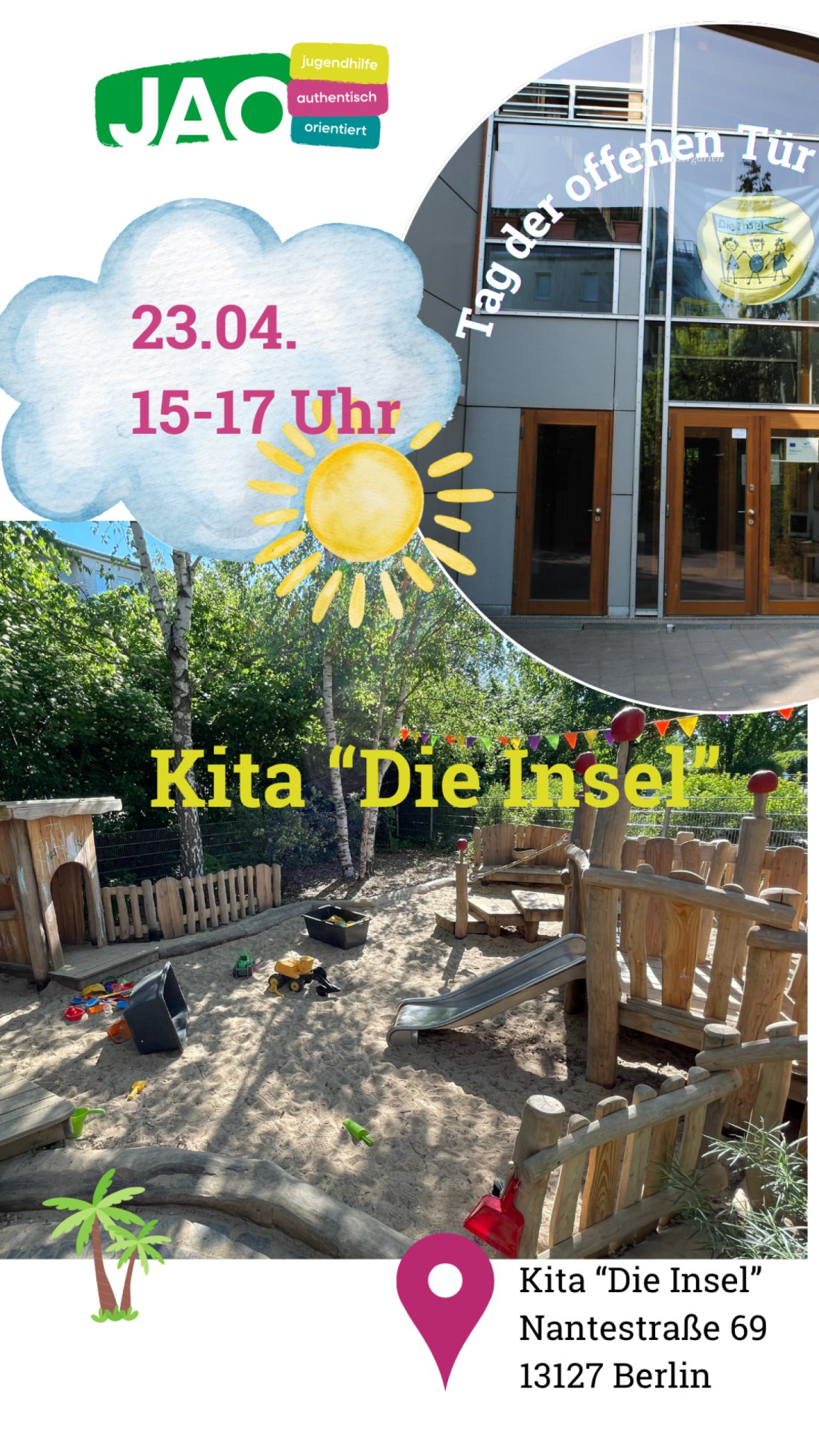 Am 23. April laden wir Sie zu unserem Tag der offenen Tür in die Kita "Die Insel" ein. Lernen Sie unsere Einrichtung kennen und lassen Sie uns ins Gespräch kommen. Wir freuen uns auf Sie und Ihre Kinder!